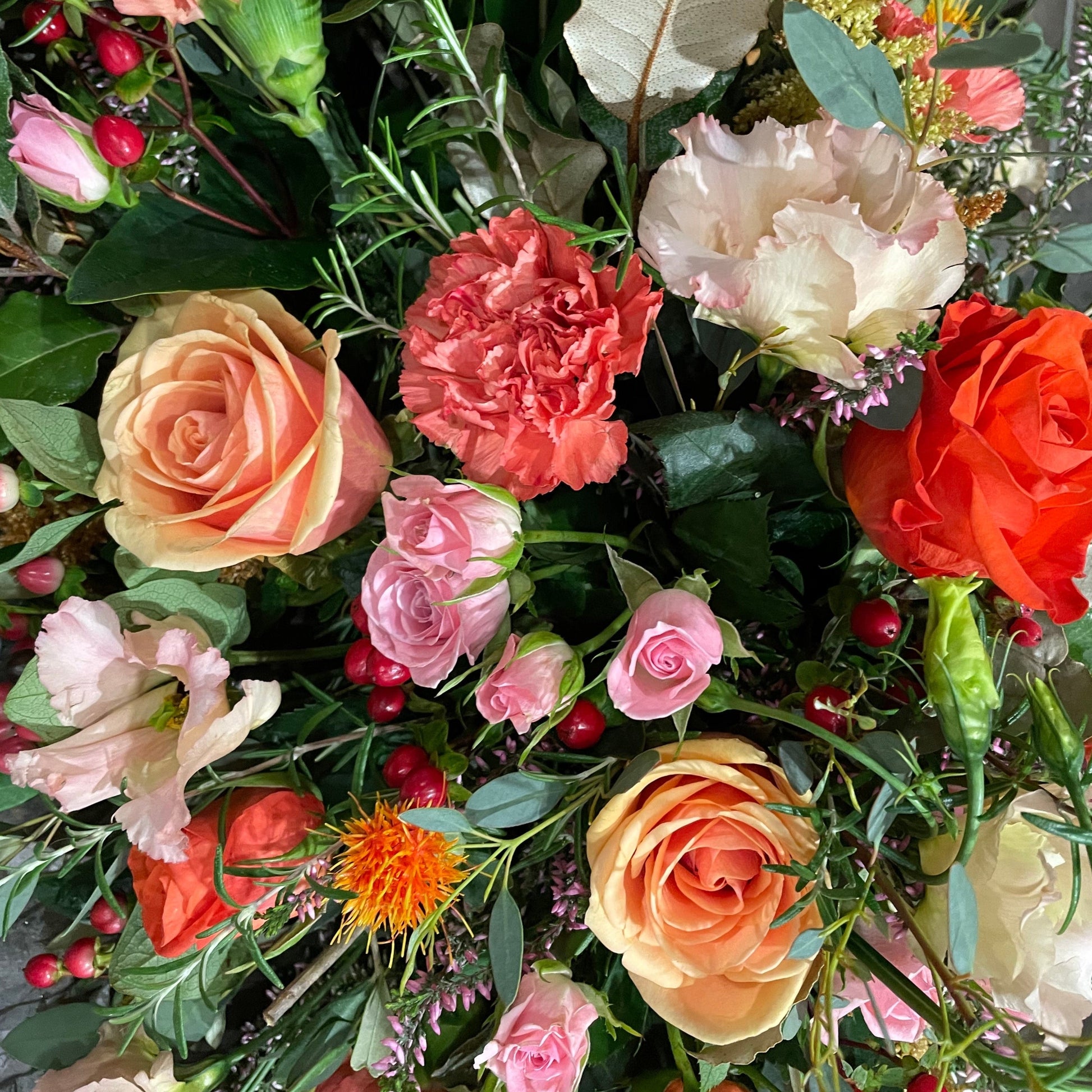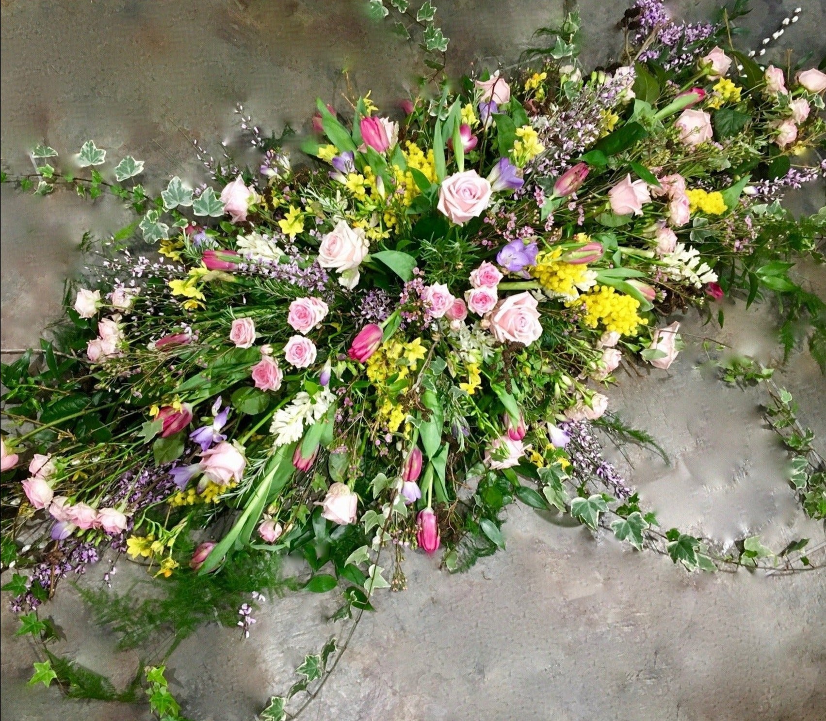 A beautiful cascading arrangement of flowers and foliage, which not only dresses the top of the coffin but also has delicate ivy trailing down the sides. Shown here in mixed colours is the Glorious option.