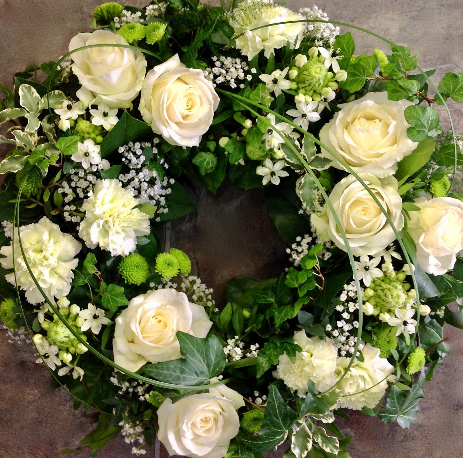 This stunning design is designed using some well loved favourite flowers such as roses and gypsophila alongside the more unusual ornithogalum to create a beautiful contemporary wreath, a lovely feature of this design is the steel grass woven through it to really give it the contemporary edge.The Gorgeous option is shown here in lime green and white.