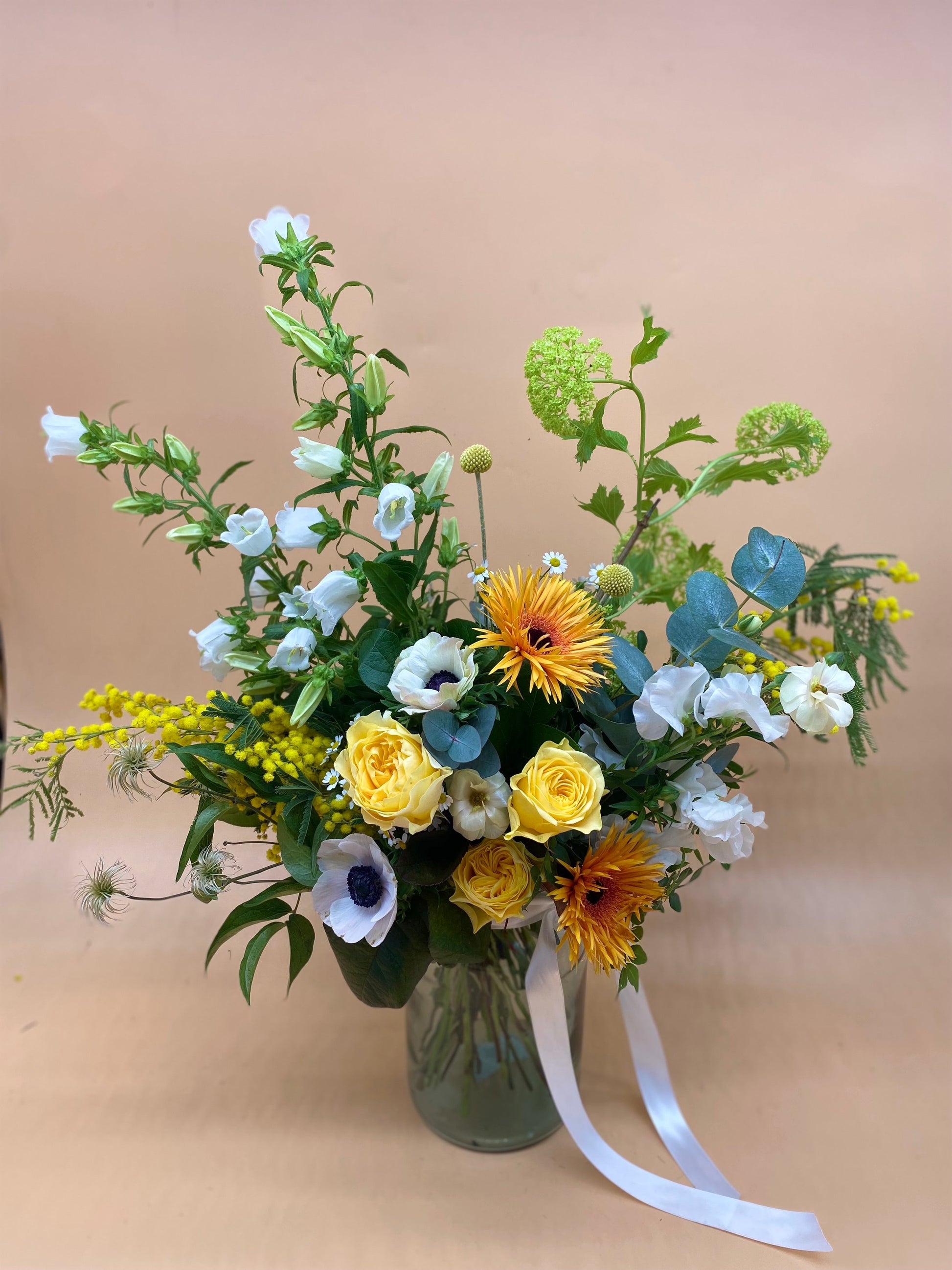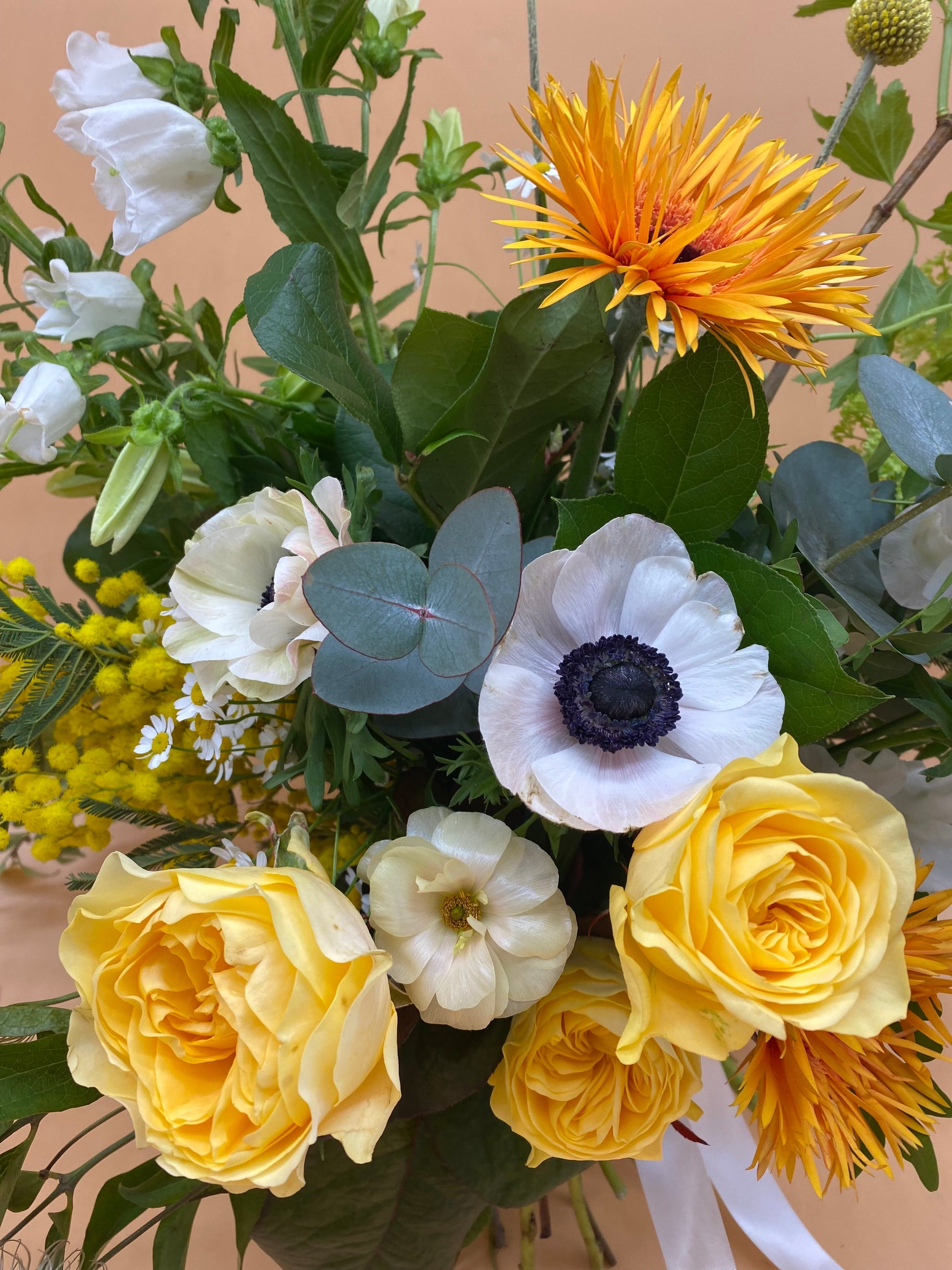 Our Spring Bouquet is full of sunshine and bounceyness.   Seasonal yellows, whites & green florals with lots of different textured foliage.  Image is just a reference as every Edie rose bouquet is bespoke.