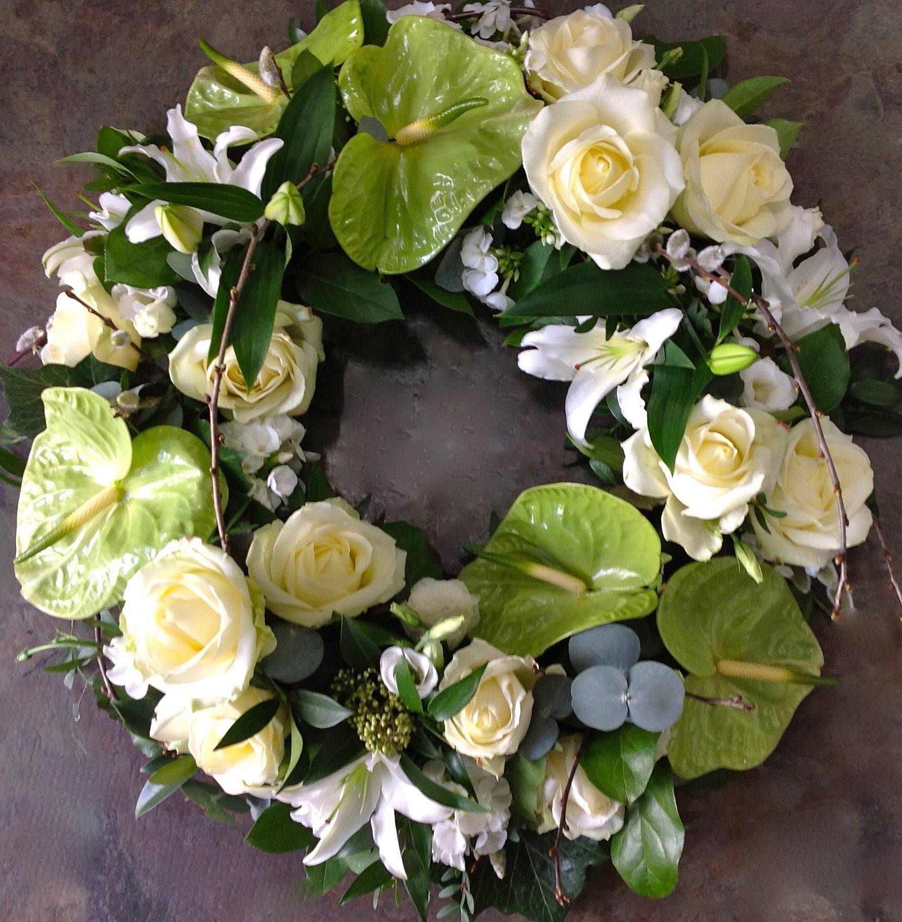 This stunning wreath is designed using tropical anthuriums, woven together with  lilies and roses, shown here in lime green and white is the Gorgeous option.