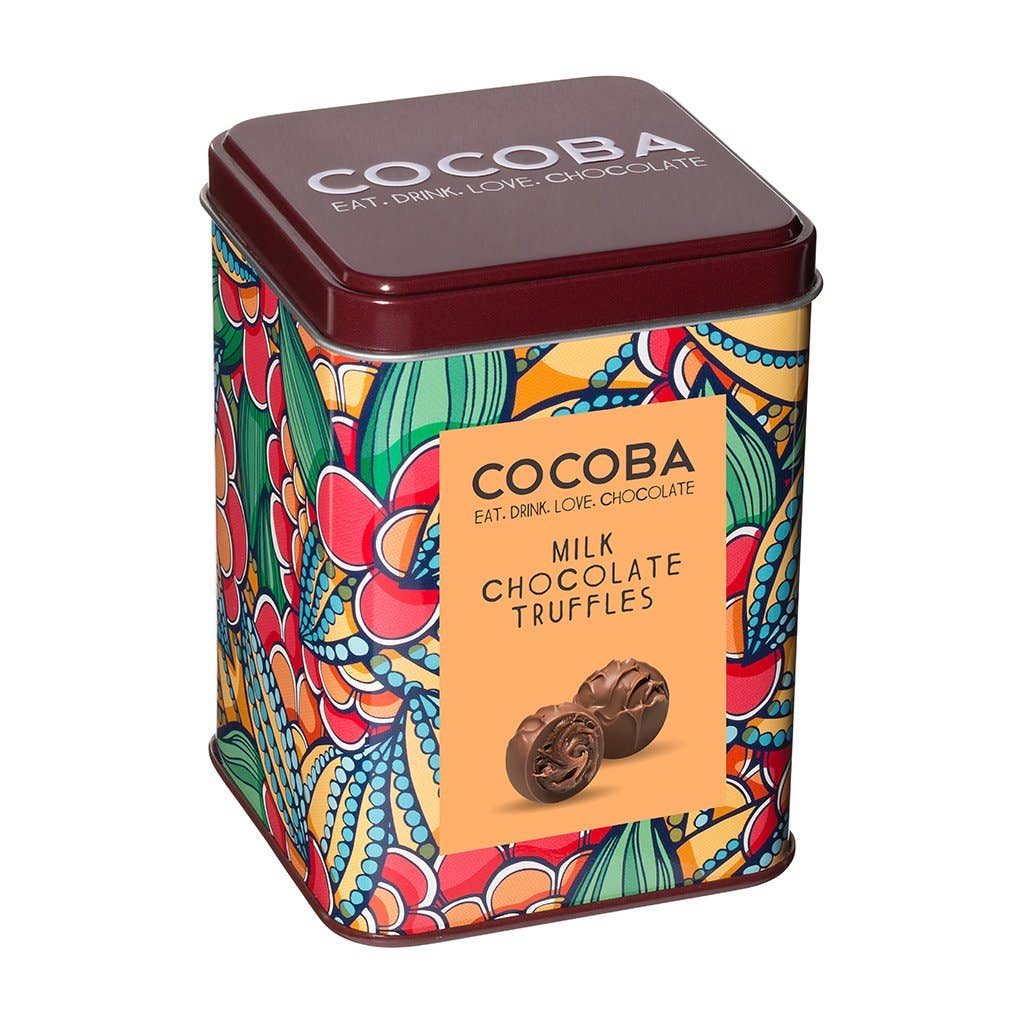 Indulgent milk chocolate truffles with a milk chocolate ganache filling, with a hint of alcohol, presented in a Cocoba tin for the perfect gift. Contains a minimum 34% cocoa solidsMinimum Weight: 120g