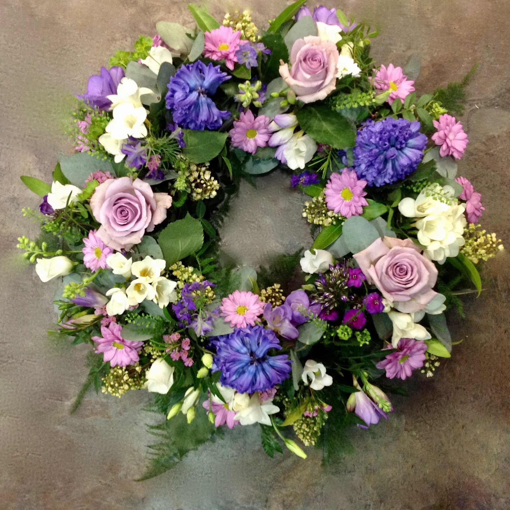 A lovely wreath designed in your choice of colours using the wonderful flowers of the season combined with a few year round favourites. Shown here a lilac and white spring wreath featuring hyacinths and freesia.