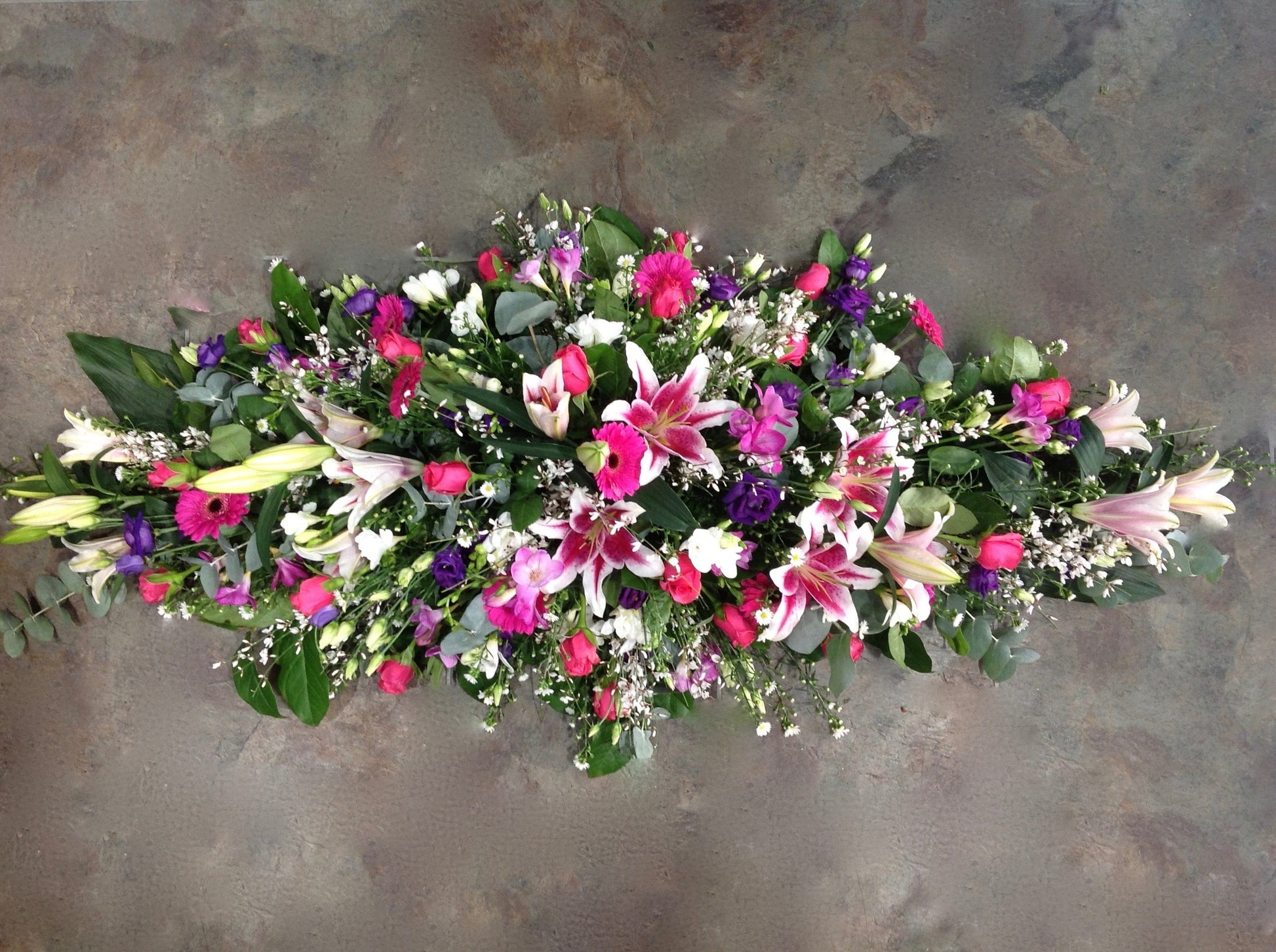 This stunning arrangement is designed using bold flowers and fragrances and a vibrant array of colour, it a lovely way to mark the celebration of a special life. Shown here in cerise, white and purple is the Gorgeous option